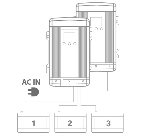 Peut charger jusqu’à 3 banques de batteries indépendantes avec un ordre de priorité programmable.