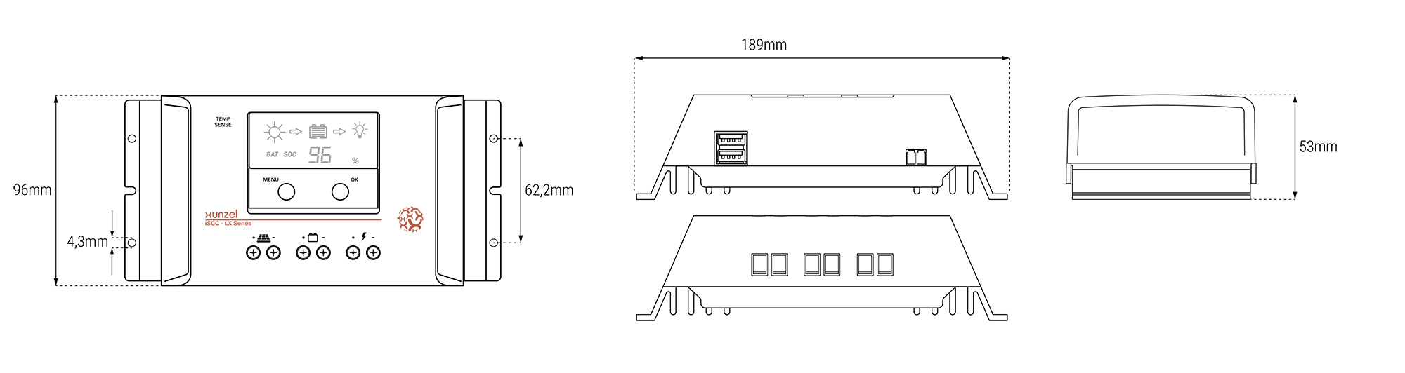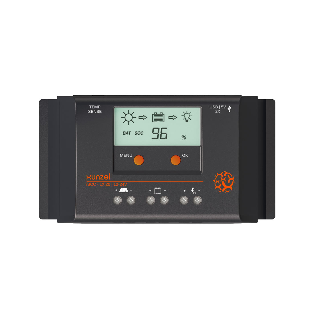 iSCC-LX-20A-12/24V XUNZEL. Régulateur solaire programmable de charge et de décharge à haut rendement. Idéal pour les panneaux solaires photovoltaïques jusqu’à 360W (12V) ou 720W (24V).