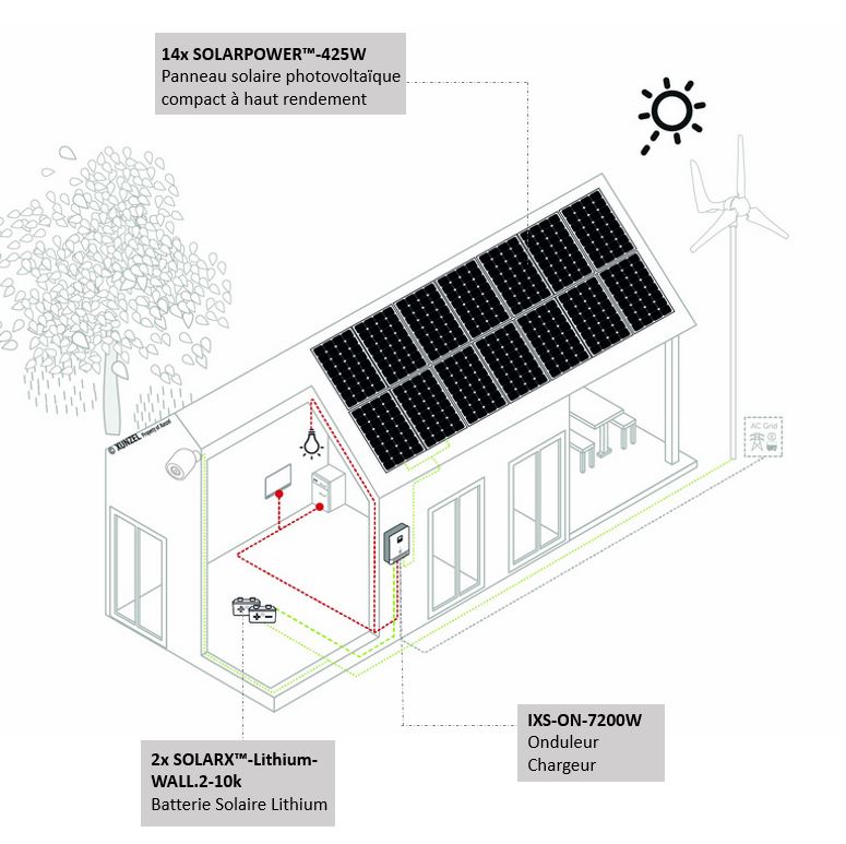 Avec onduleur/chargeur MPPT IXS-ON-7200W (14,4kW en crête) sortie 230V/50Hz.