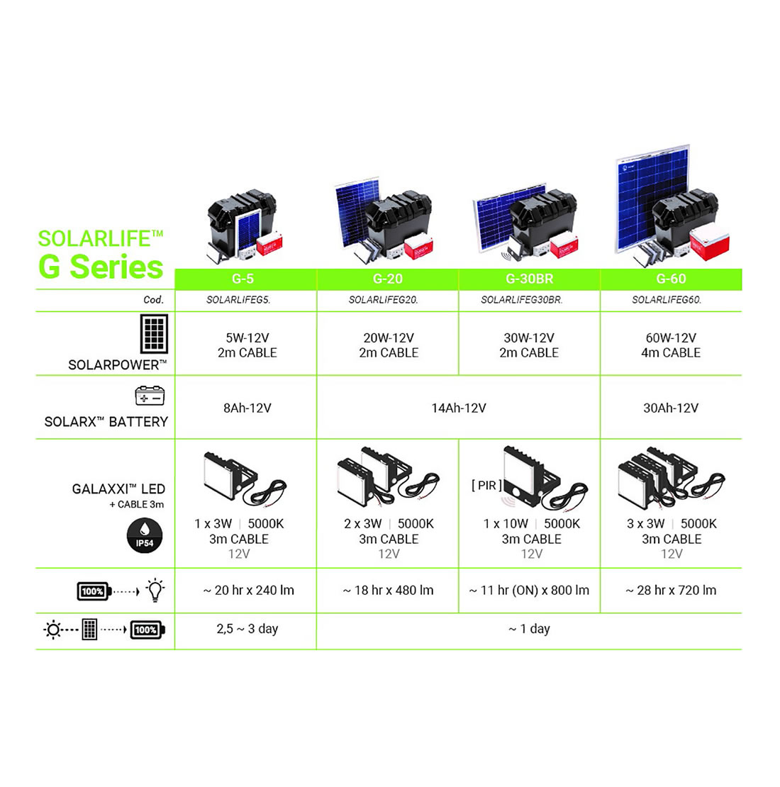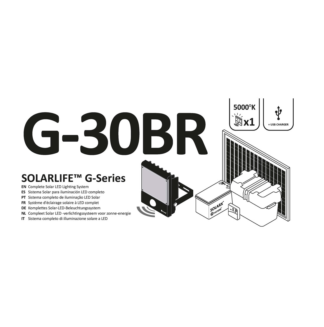 SOLARLIFE G-30BR. Sistema completo de iluminação LED pronto para usar. Ideal para uso industrial, profissional, jardim, HORECA ou recreativo.