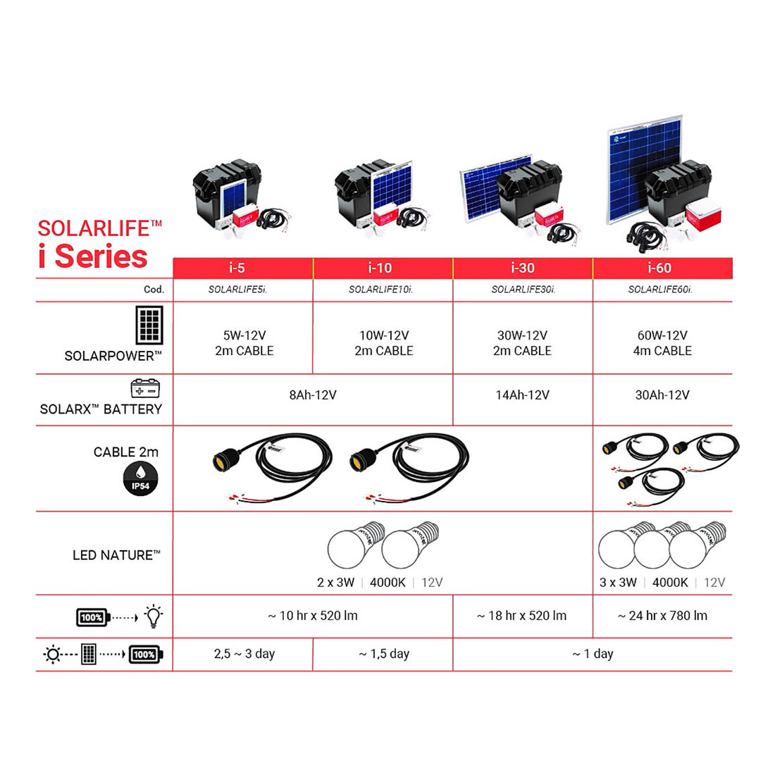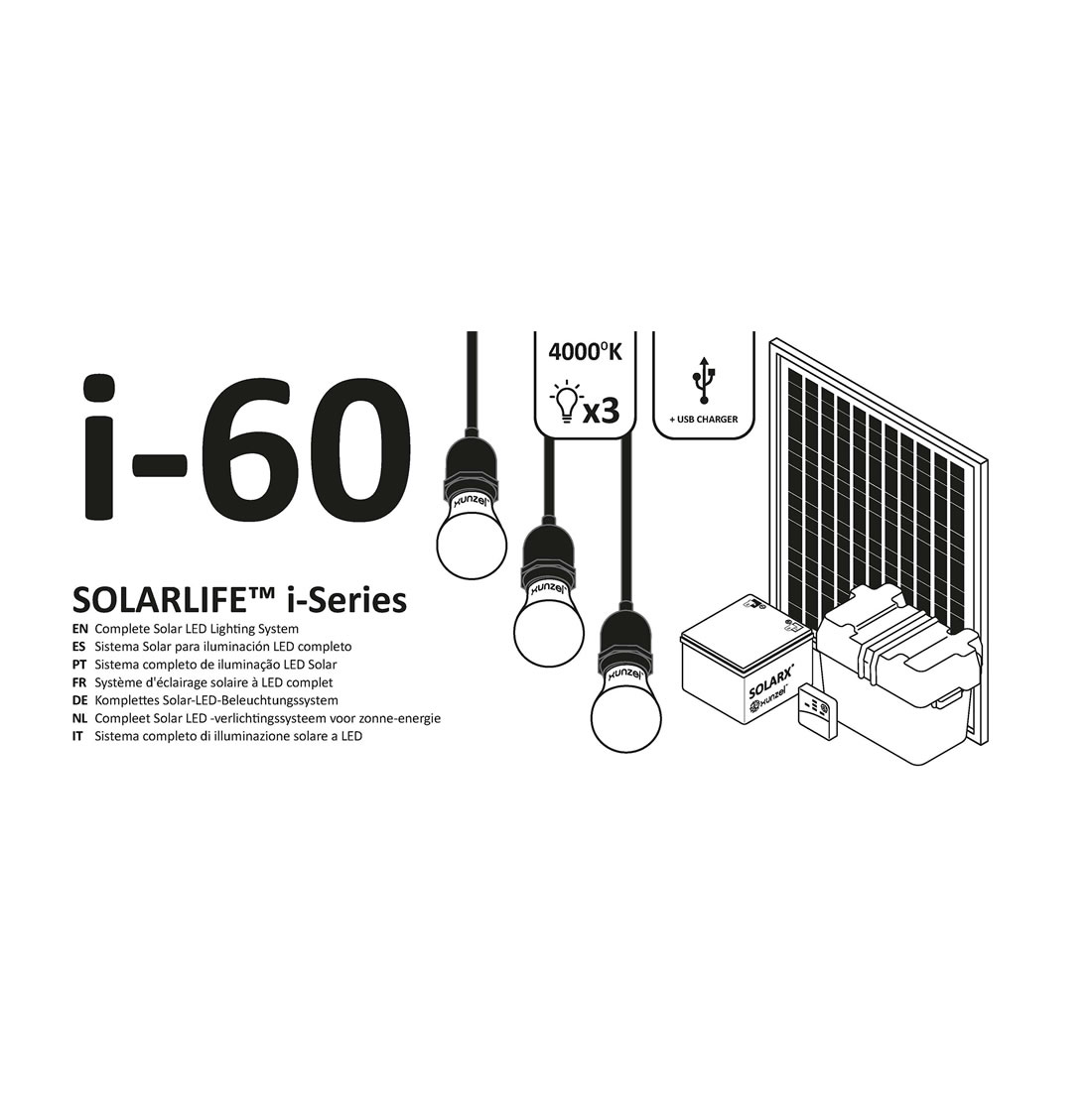 SOLARLIFE i-60. Sistema completo de iluminação LED pronto para usar. Ideal para uso industrial, profissional, jardim, HORECA ou recreativo.